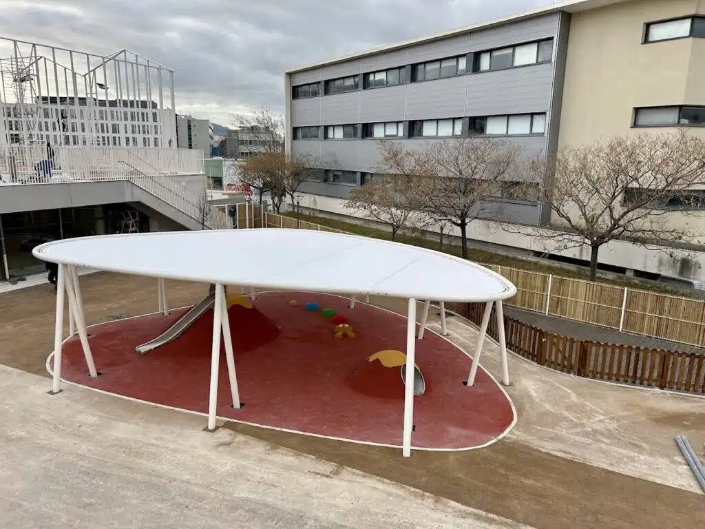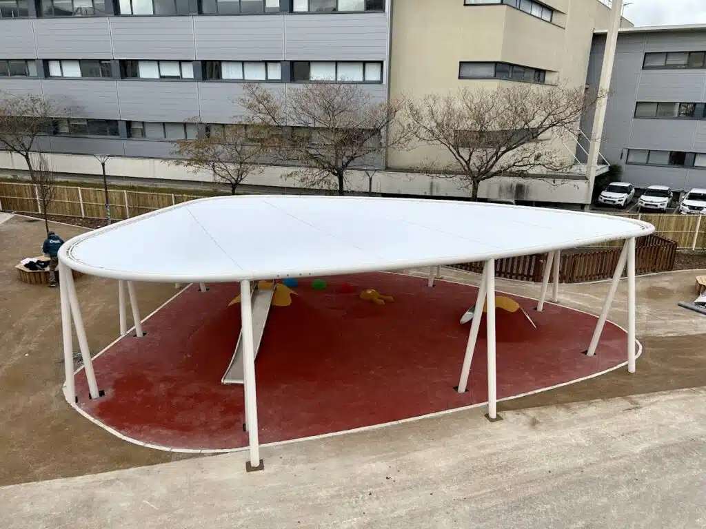 Installation d’une toile sur mesure Soltis86 de Serge Ferrari sur une structure métallique arrondie fait par la Métallerie Chevalier pour la couverture d’un espace jeux d’une cour d’école à Marseille.