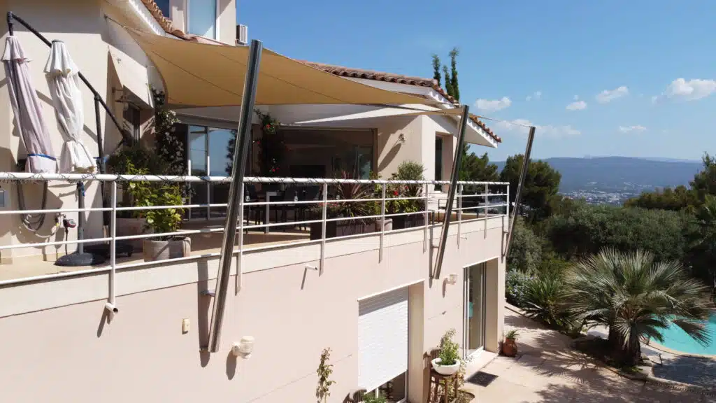Lorsque votre terrasse ou votre jardin ne dispose pas de supports existants, nous concevons des mâts sur mesure et réalisons l’installation complète des points d’ancrage.