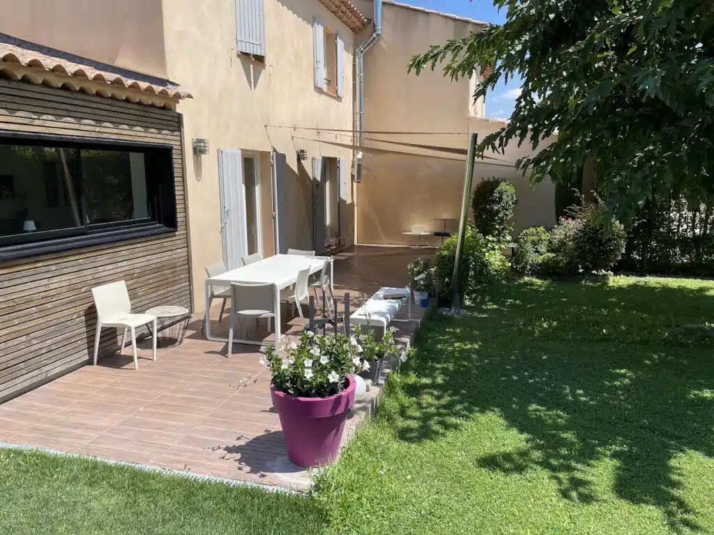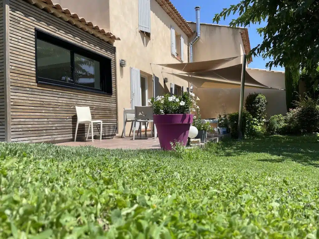 Ombrage de la terrasse de ce pavillon à Aix-en-Provence (13). Installation de 3 voiles d’ombrage croisées, une voile rectangulaire et 2 voiles triangulaires. Les voiles d’ombrage sont réalisées sur-mesure dans nos ateliers à Sanary-sur-Mer.
